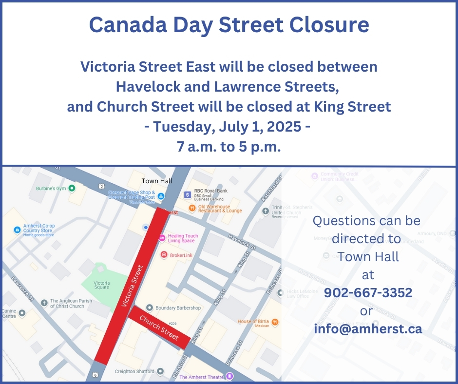 Victoria Street East will be closed between Havelock and Lawrence Streets, and Church Street will be closed at King Street on Tuesday, July 1, 2025, from 7 a.m. to 5 p.m. for Amherst's annual Canada Day celebrations.